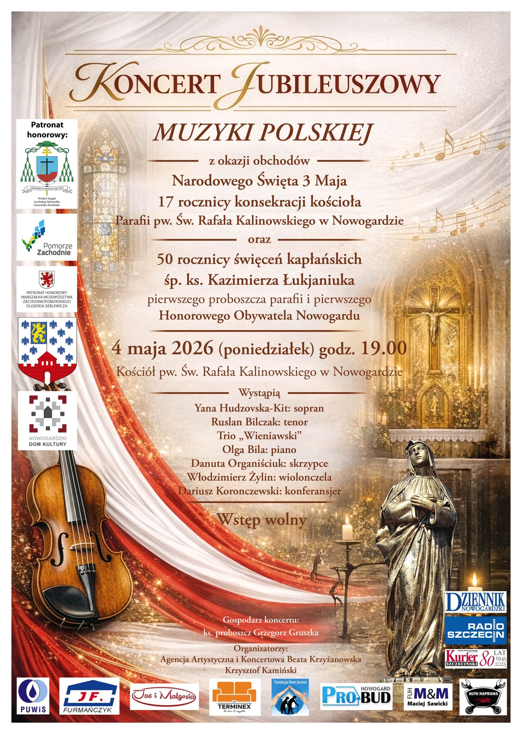 - ,,Koncert Jubileuszowy Muzyki Polskiej” odbędzie się w poniedziałek 4 maja br. o godzinie 19.00 w Nowogardzie w kościele pw. Św. Rafała Kalinowskiego. Wstęp wolny.
