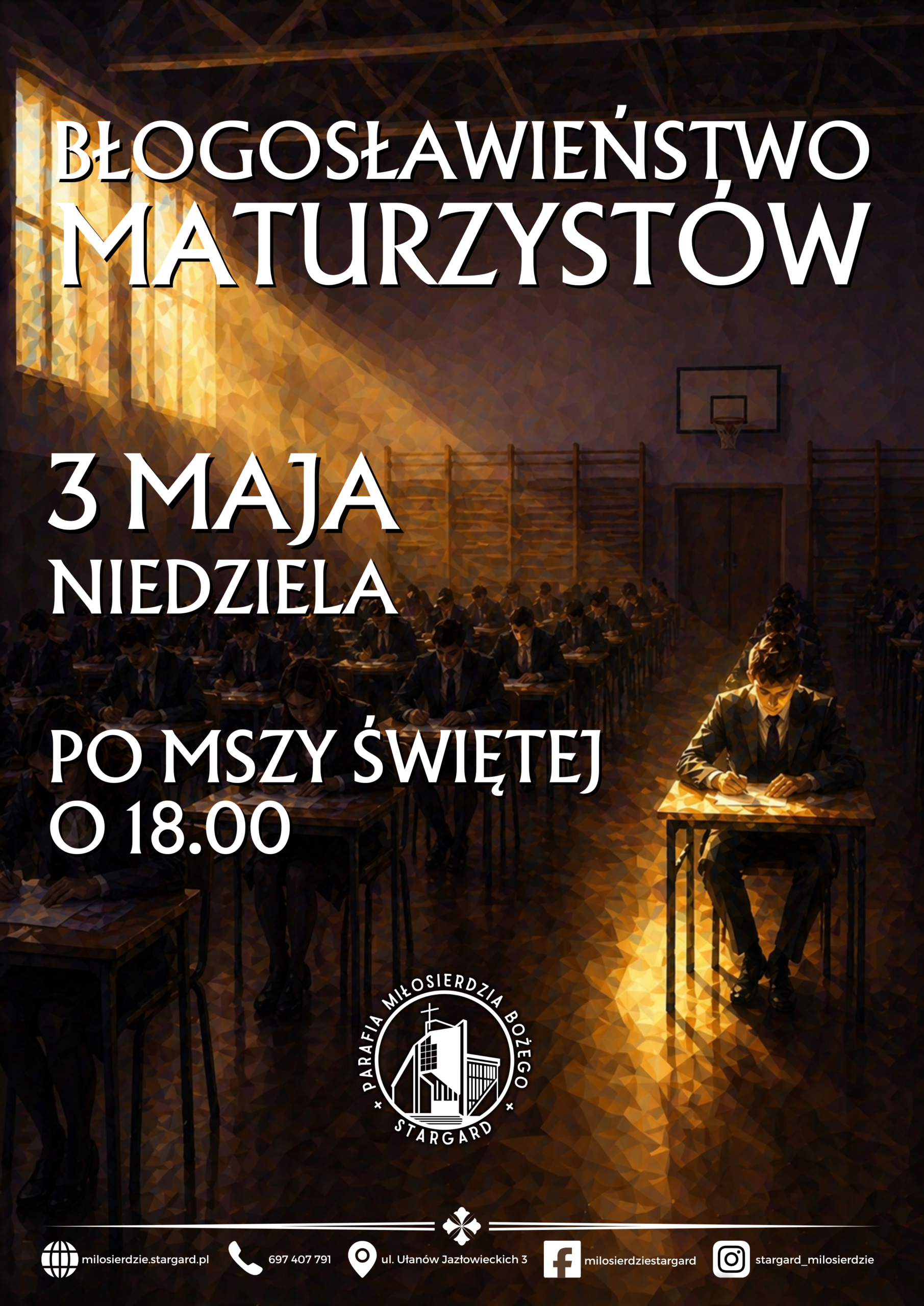 - Za tydzień w niedzielę na Mszę św. o godz. 18:00 zapraszamy tegorocznych maturzystów, którym przekażemy szczególne Błogosławieństwo na czas egzaminu dojrzałości.