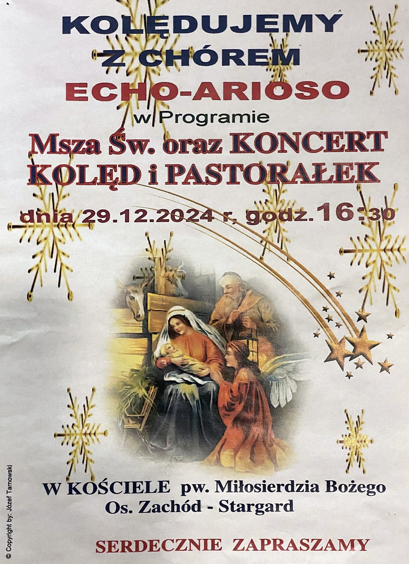 Jak co roku czekaliśmy na świąteczny repertuar kolęd i pastorałek przygotowany przez znany i lubiany stargardzki chór mieszany Echo – Arioso im. Stanisława Moniuszki przy Domu Kultury Kolejarza w Stargardzie. Tegoroczne kolędowanie chór rozpoczął 29 grudnia w niedzielę Świętej Rodziny z Nazaret tuż po Jubileuszach Małżeńskich, Oprawę popołudniowej Mszy świętej powierzono miejscowym chórzystom pod dyrygenturą Jerzego Krawczyńskiego. Przepięknie wykonano nie tylko w języku polskim różne znane świąteczne utwory: Wśród nocnej ciszy, Triumfy Króla Niebieskiego i Zaśnij Dziecino, a wśród nich m.in. najstarszą zachowaną polską kolędę, pochodzącą z 1424 roku, pt.: Zdrow bądź Królu Anielski, została ona zapisana w kazaniu Jana Szczekny, spowiednika królowej Jadwigi Andegaweńskiej.
