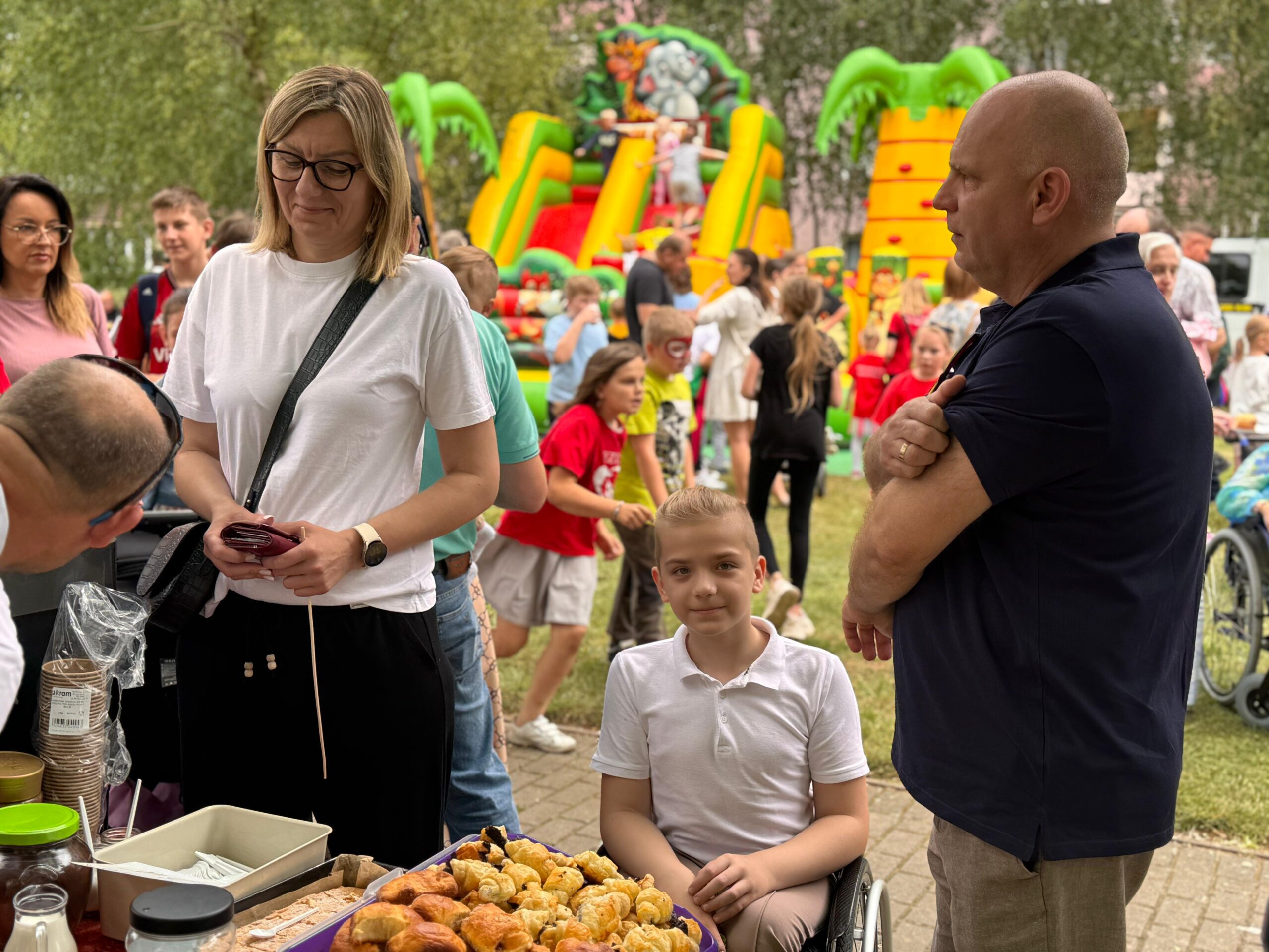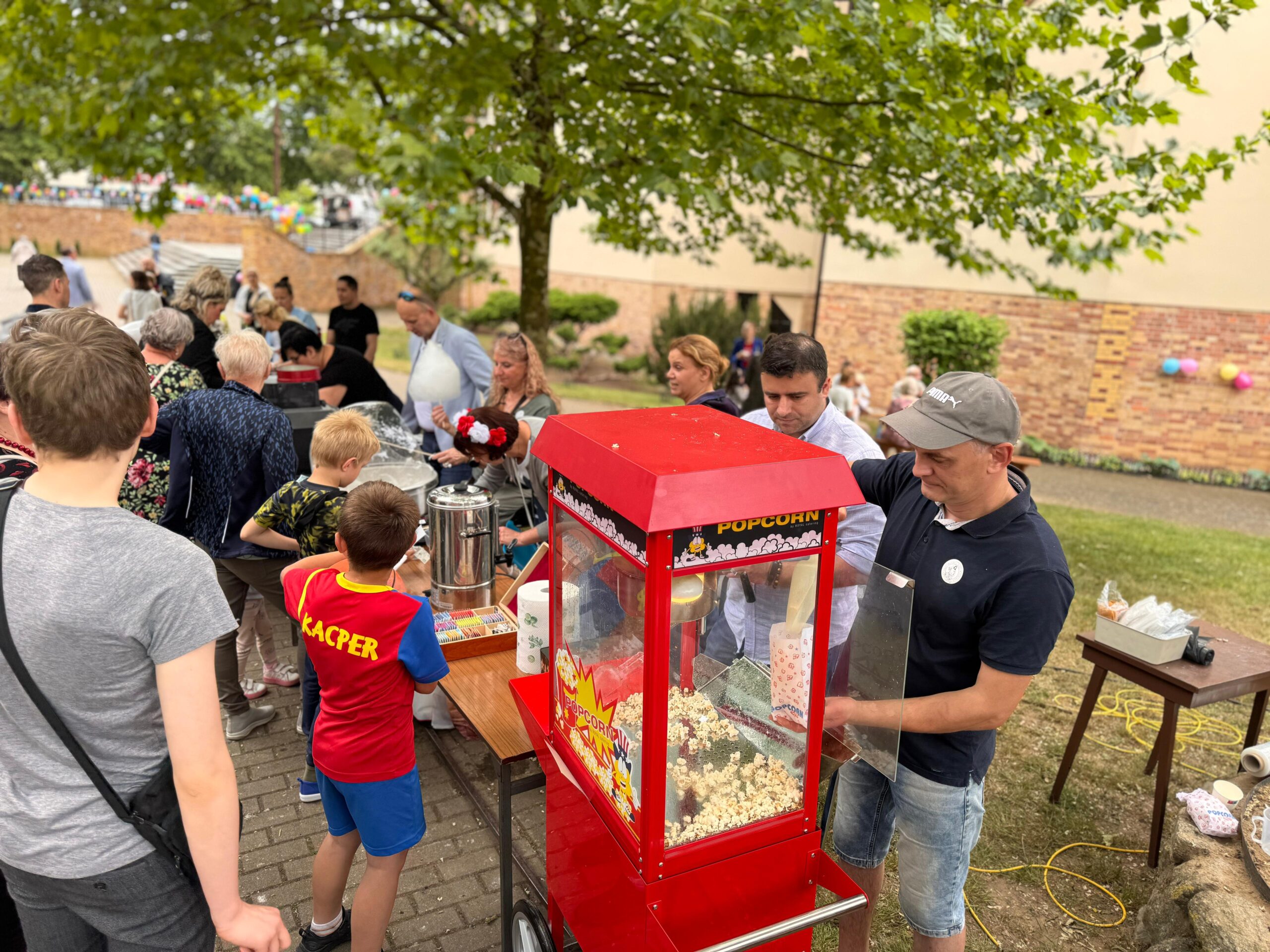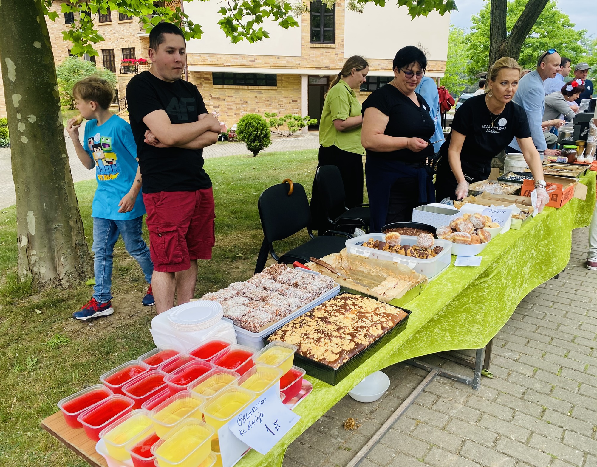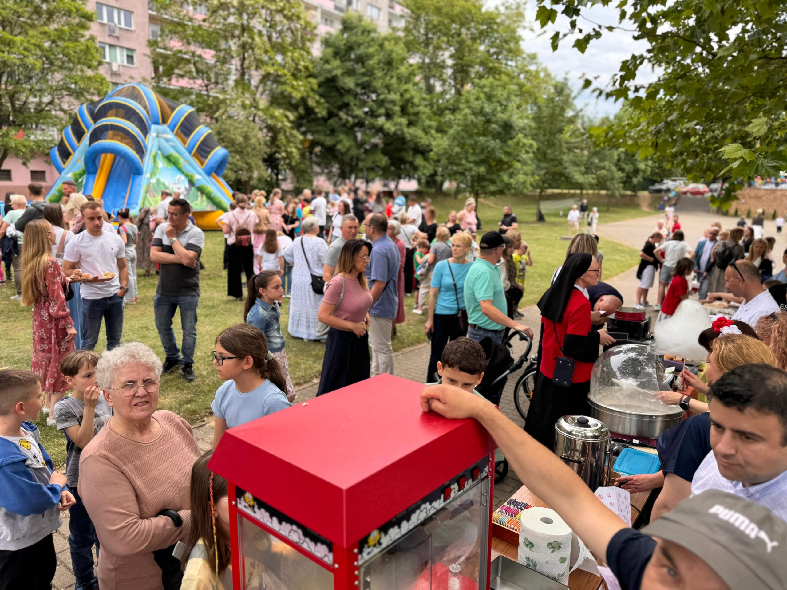 Zaprezentowały się różne stoiska i punkty wystawiennicze. Całoroczny zespół kawiarenki parafialnej FAUSTYNKA zadbał o słodkie stoły i ciepłe napoje w tym pyszną włoską kawę. Spisali się Apostołowie Bożego Miłosierdzia przyrządzając wzorowo grilla i serwując pyszne kiełbaski oraz kaszankę. Nie zabrakło straganów z rękodziełem i miodem. Największym powodzeniem cieszyły się słodkości, w tym rozmaite ciasta, ciasteczka, rogaliki upieczone z miłością przez utalentowane parafianki oraz wata cukrowa i popcorn. Jak co roku największym wzięciem cieszyły się zamki dmuchane do których ustawiały się długie kolejki.