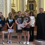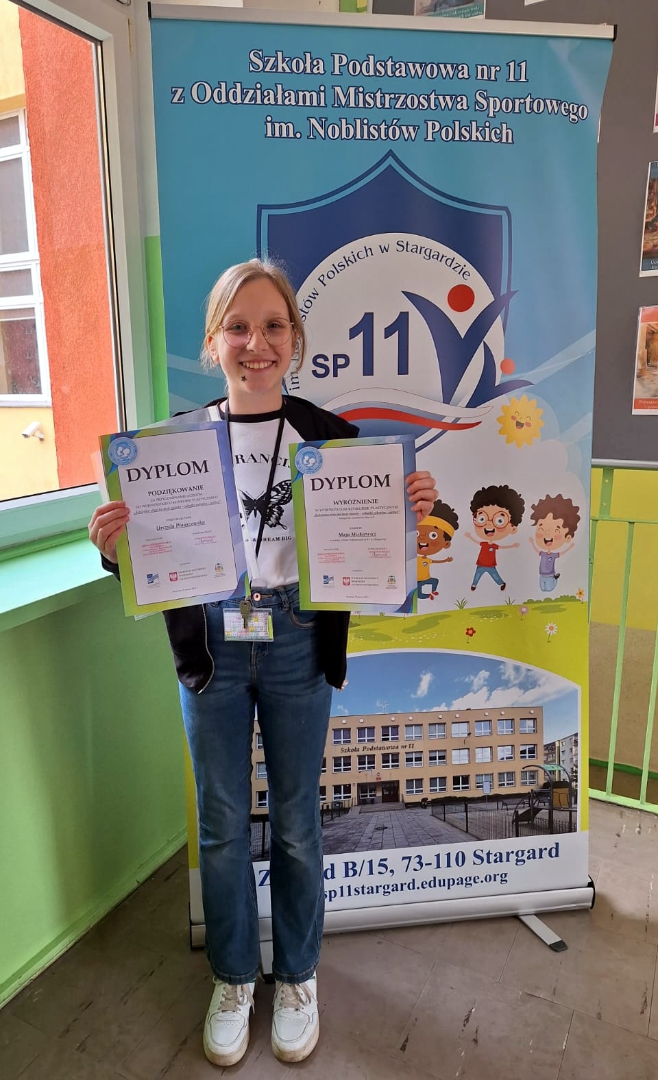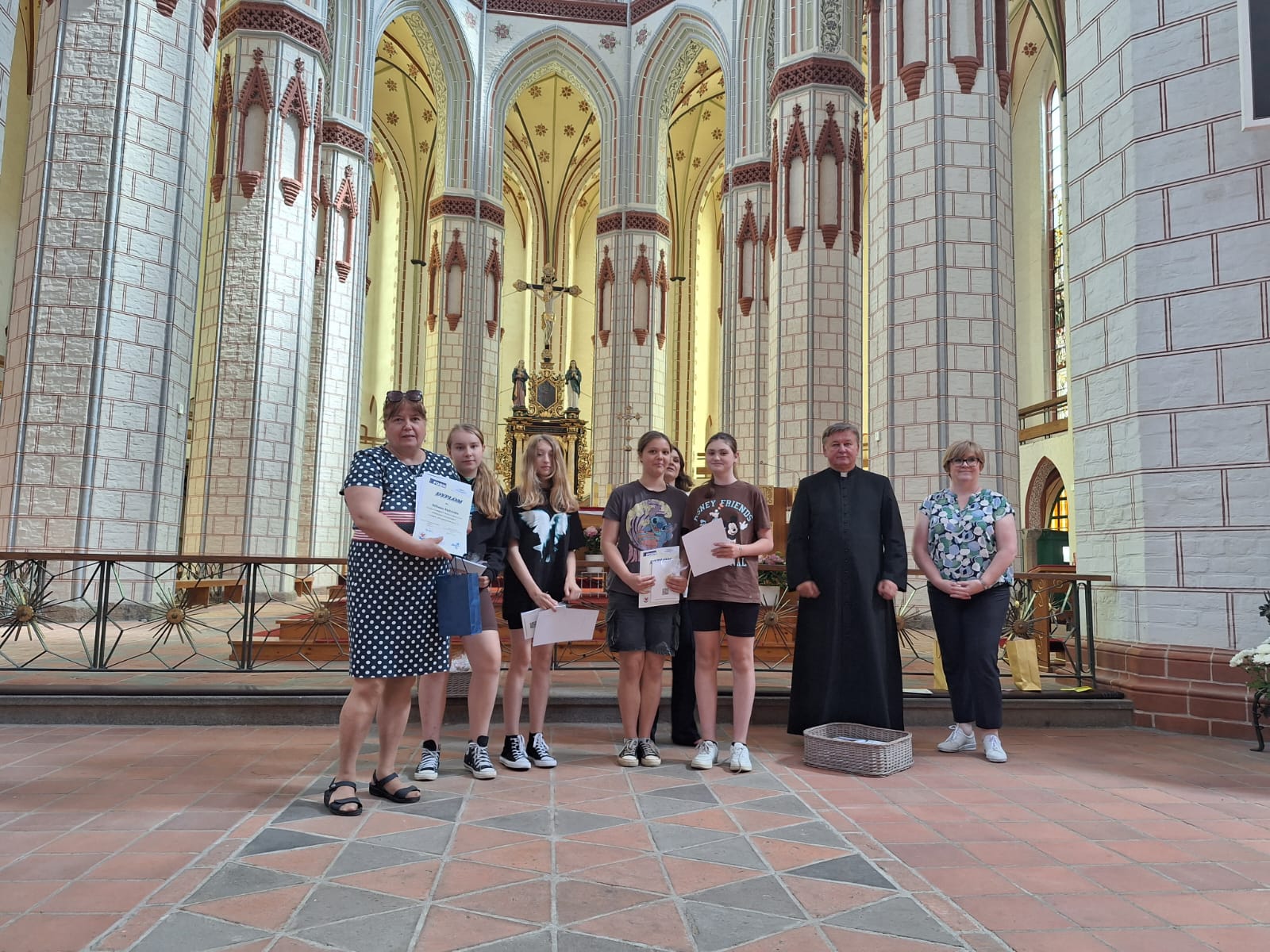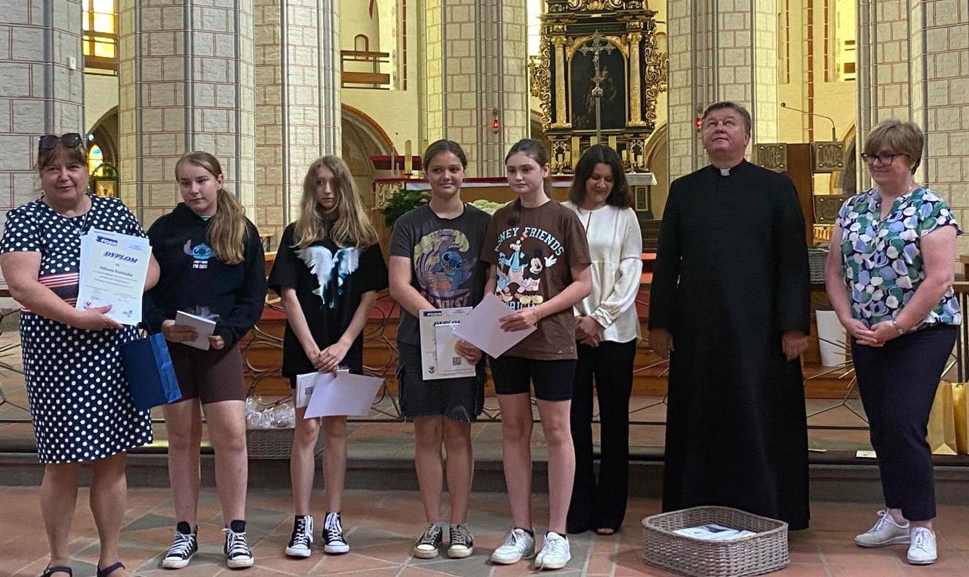 Cieszymy się kolejnymi sukcesami uczniów szkoły podstawowej nr 11 z Oddziałami Mistrzostwa Sportowego im. Noblistów Polskich. We wtorek 18 czerwca w Kolegiacie pw. Najświętszej Maryi Panny Królowej Świata w Stargardzie odbyło się wręczenie nagród za konkurs plastyczny pt.: Zapraszamy do Kolegiaty, organizowany przez parafię przy kolegiacie oraz Powiatowy Ośrodek Doskonalenia Nauczycieli. Dzięki przygotowaniu przez katechetkę Urszulę Płauszewską i wizycie w ramach warsztatów: Zwiedzamy stargardzkie kościoły i parafie udało się wywalczyć dwa drugie miejsca w kategorii szkół podstawowych klas: 4-8. Nagrody wygrali: Miłosz Kuźniak z klasy V A i Pola Kołacz z klasy V C, a wszyscy pozostali uczestnicy otrzymali dyplomy i nagrody pocieszenia. Pięknie przygotowane prace za zgodą młodych autorów wezmą udział w aukcji charytatywnej. Gratulujemy i życzymy kolejnych sukcesów!