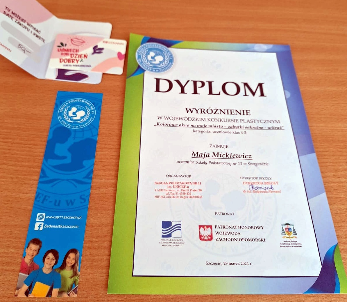 Szkoła wzięła udział w Wojewódzkim Konkursie Plastycznym pod patronatem Wojewody Zachodniopomorskiego pt.: Kolorowe okno na moje miasto – zabytki sakralne – witraż. Wyróżnienie i nagrodę pieniężną otrzymała Maja Mickiewicz. Gratulujemy!
