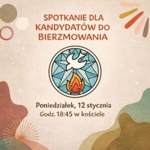 Rozpoczynamy parafialne przygotowanie do przyjęcia sakramentu bierzmowania w 2026 roku. Kandydatów do przyjęcia sakramentu bierzmowania zapraszamy na niedzielne Msze święte o godz. 18:00 Kandydaci sami pobierają i składają deklaracje i formularze do wypełnienia w zakrystii.