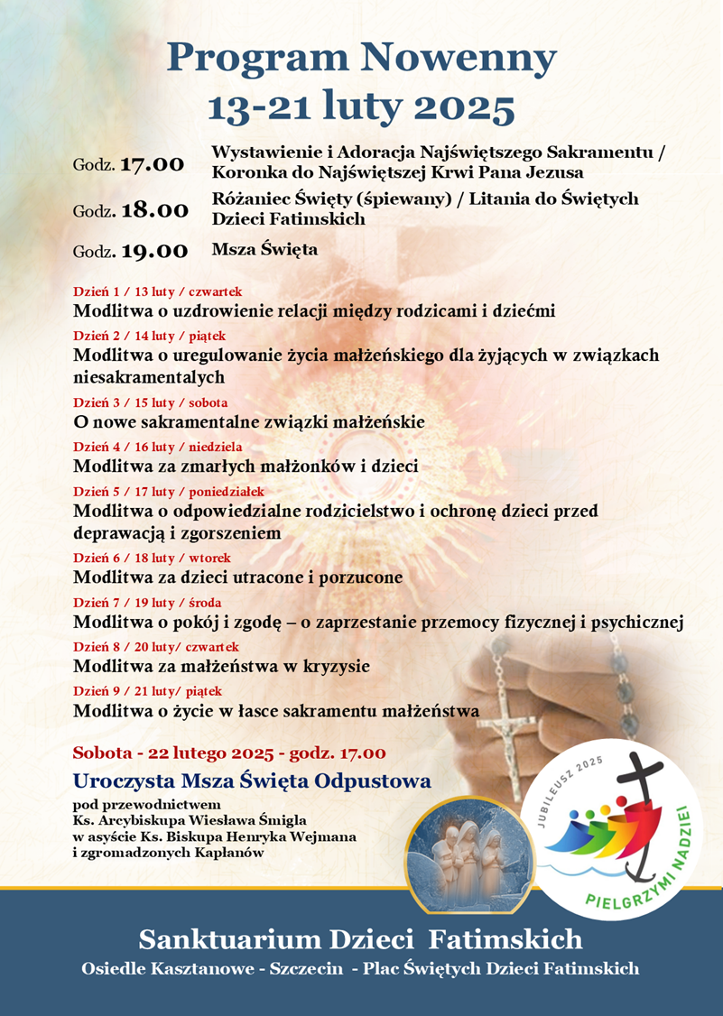 - Od czwartku 6 lutego rozpoczniemy Nowennę do bł. ks. Michała Sopoćki, założyciela Zgromadzenia Sióstr Jezusa Miłosiernego. Modlitwa codzienne o godz. 17:45, do skrzynki modlitw będzie można zapisać intencje, Msza na zakończenie Nowenny w sobotę o 15 lutego o godz. 10:00.
