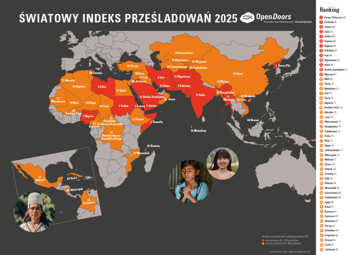 - Chrześcijańska organizacja pomocowa OPEN DOORS od 70 lat podejmuje działania na rzecz prześladowanych chrześcijan w wielu krajach, publikując dokument o nazwie Światowy Indeks Prześladowań www.opendoors.pl/przesladowania-chrzescijan/swiatowy-indeks-przesladowan (w załączniku jest grafika). Organizacja przygotowuje również materiały i raporty, na podstawie których przypominają o swoich prawach chrześcijanom. OPEN DOORS zachęca do współpracy parafie, wspólnoty, grupy modlitewne. Organizacja ma możliwość przeprowadzenia prelekcji o prześladowanych, rekolekcji, świadectw. Osoby zainteresowane współpracą prosimy o kontakt z p. Maciejem Maliszakiem tel.: 579 078 797, mail: maciej.maliszak@opendoors.pl. Strona internetowa organizacji: www.opendoors.pl
