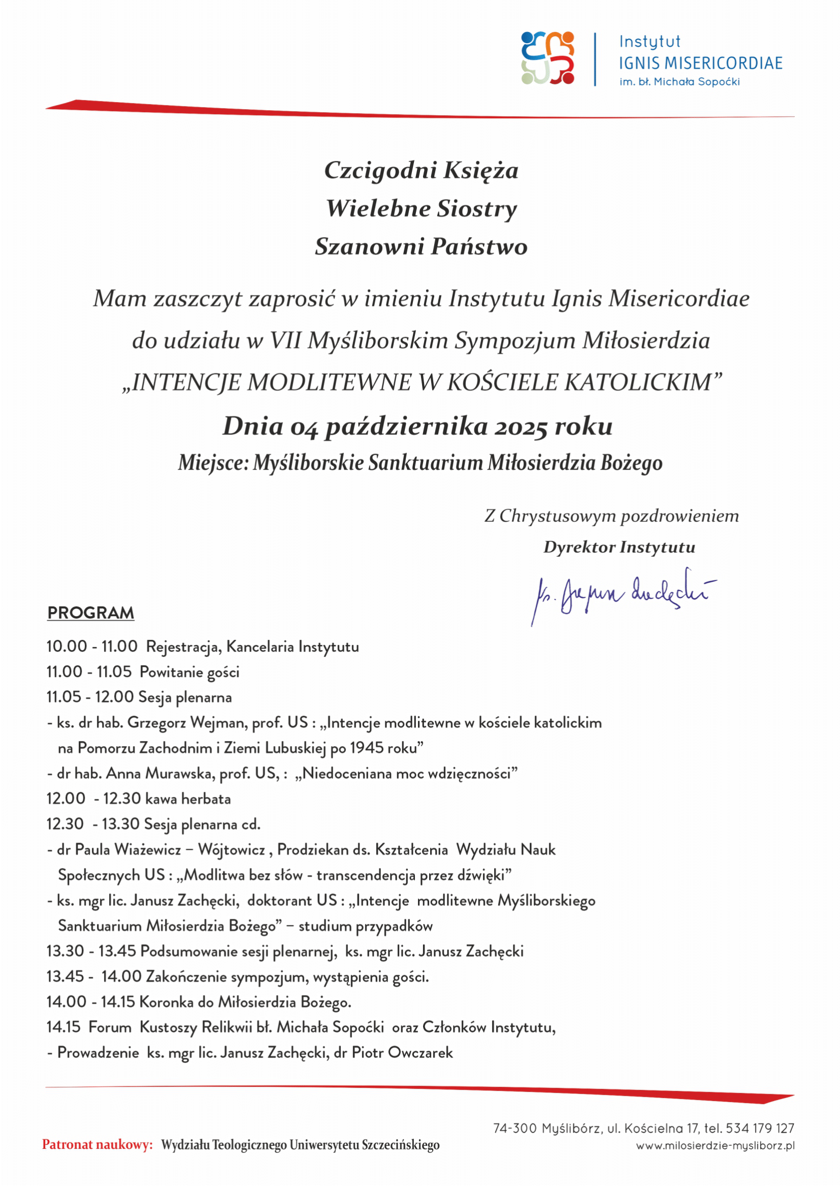 „Zwycięska Królowa Polski – nasza nadzieja”. Uroczysta Msza Św. o godz. 12.30, pod przewodnictwem Abpa Wiesława Śmigla. Uroczystość poprzedzą – rekolekcje – Dni Maryjne, od 8 do 10 października, którym będzie przewodniczył o. Krzysztof Kowalski OSPPE z Jasnej Góry. Msze św. z naukami no godz. 15.00 i 18.00. Zapraszamy kapłanów, siostry zakonne oraz wszystkich czcicieli Matki Bożej do wspólnej modlitwy z Biskupami Metropoli. - Duszpasterstwo Akademickie zaprasza wykładowców, pracowników Wyższych Uczelni, duszpasterzy, studentów i absolwentów na Mszę Św. inaugurującą nowy Rok Akademicki 2025/2026, która będzie sprawowana w niedzielę, 12 października br., o godz. 20.00 w Sanktuarium Najświętszego Serca Pana Jezusa w Szczecinie. Mszy Św. będzie przewodniczył Abp Metropolita Wiesław Śmigiel.