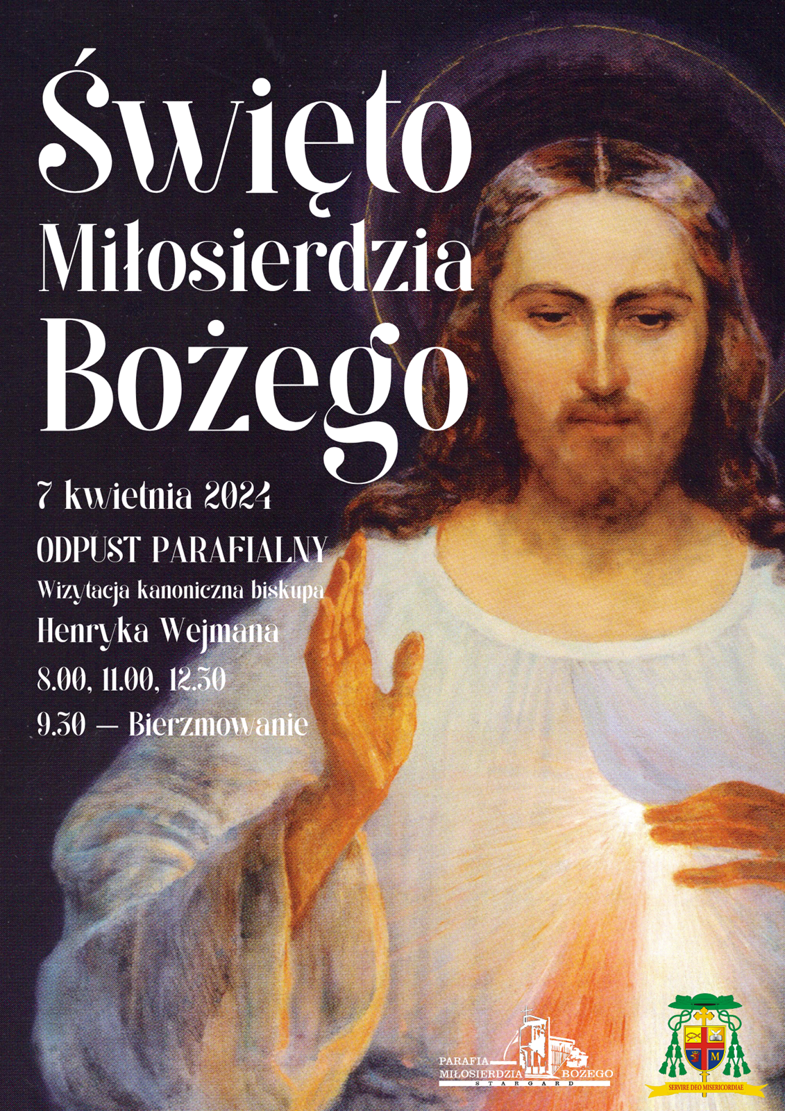 - Dziś II niedziela Wielkanocy – Święto Miłosierdzia Bożego, uroczystość odpustowa naszej parafii. Wszystkie Msze święte są sprawowane w tym dniu w naszej świątyni parafialnej jako odpustowe! (6:30, 8:00, 9:30, 11:00, 12:30, 16:30 i 18:30) Gościmy wśród nas Jego Ekscelencję ks. Biskupa pomocniczego Prof. Henryka Wejmana, który wygłosi Słowo Boże podczas liturgii o godzinach:8:00, 9:30 (z sakramentem Bierzmowania), 11:00 i 12:30. Łaski odpustu zupełnego może dostąpić w tym dniu każdy wierny który: w czasie wizytacji pasterskiej weźmie udział w czynności świętej, której przewodniczy wizytator, albo w dzień uroczystości tytułu nawiedzi pobożnie kościół i odmówi modlitwy: Ojcze nasz i Wierzę. O 15:00 w godzinie śmierci Pana Jezusa na Krzyżu zapraszamy na Koronkę Bożego Miłosierdzia. w Kościele rozpoczyna się Tydzień Miłosierdzia, Caritas prowadzi dziś zbiórkę do puszek w ramach akcji: pt. Dzień dobra. Kawiarenka parafialna zaprasza nas na odpustowe przysmaki po Mszy św. o 8:00, 9:30 i 11:00. W ambicie prezbiterium została przygotowana kolejna wystawa wyjątkowych współczesnych ikon. Wieczorem zapraszamy o 19:30 na koncert odpustowy pt. Misericordias Domini przygotowany przez znany stargardzki chór Cantore Gospel pod kierunkiem Pani Marii Pyry.