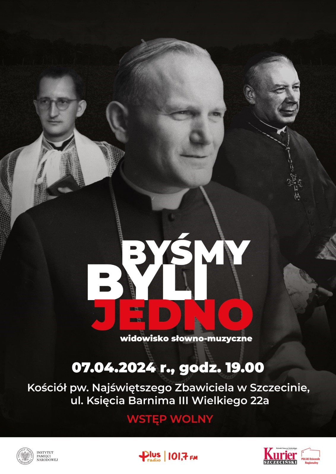 - Instytut Pamięci Narodowej serdecznie zaprasza na widowisko słowno-muzyczne BYŚMY BYLI JEDNO, w niedzielę, 7 kwietnia o godz. 19.00, które odbędzie się w kościele pw. Najświętszego Zbawiciela w Szczecinie, ul. Księcia Barnima III Wielkiego. Będzie to muzyczna opowieść o trzech kapłanach niezłomnych wobec komunistycznej władzy – o Ks. Wojtyle – Papieżu Janie Pawle II, o Kard. Wyszyńskim oraz o Ks. Blachnickim
