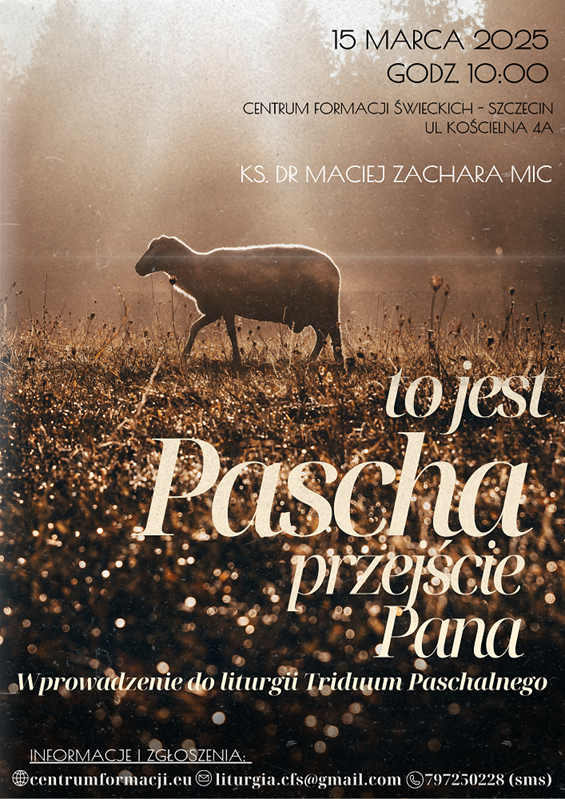 2. Centrum Formacji Świeckich przekazuje informację dotyczącą Katechezy mistagogicznej: „To jest PASCHA, przejście Pana. Wprowadzenie do liturgii Triduum Paschalnego„, którą wygłosi ks. dr Maciej Zachara MIC z Lublina. Odbędzie się ona w Centrum Formacji Świeckich przy Wspólnocie Sióstr Uczennic Krzyża (ul. Kościelna 4a, Szczecin-Stołczyn) w sobotę, 15 marca o godz. 10:00. Szczegółowe informacje i zapisy na stronie www.centrumformacji.eu