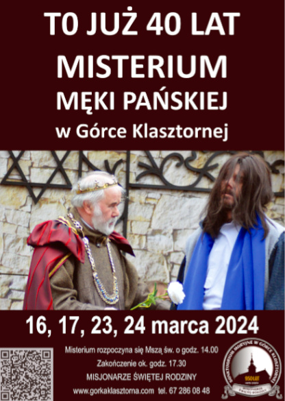 - Sanktuarium Maryjne w Górce Klasztornej (Diecezja Bydgoska) zaprasza na jubileuszowe 40. Misterium Męki Pańskiej. Misterium rozpoczyna się Mszą Św. o godz. 14.00, a kończy ok godz. 17.30. Terminy: 16, 17, 23, 24 marca br. Kontakt: Ks. Tomasz Górecki MSF tel. 515 364 937. Szczegółowe informacje pod linkiem: https://gorkaklasztorna.com/wydarzenia.