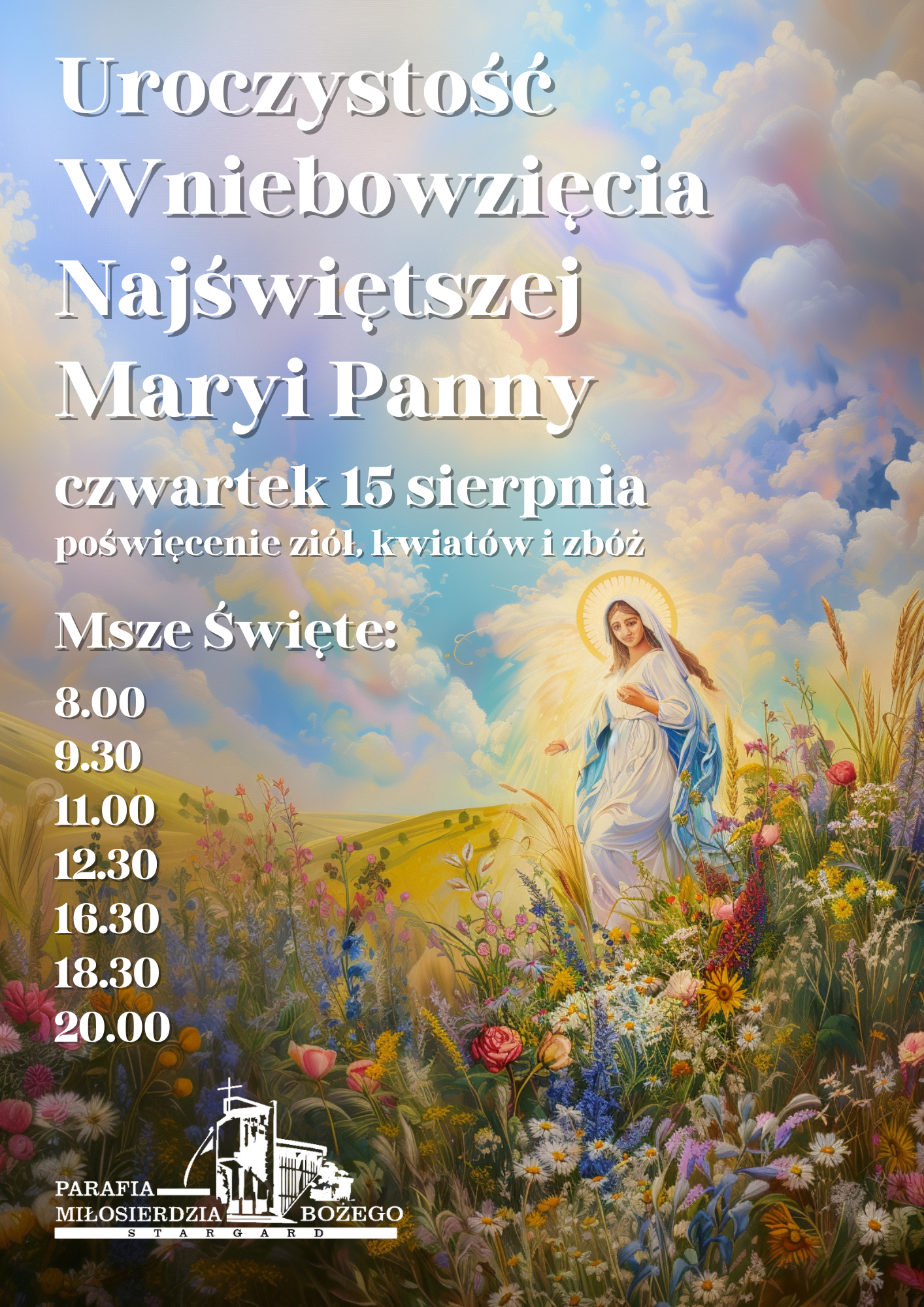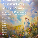 • w czwartek 15 sierpnia: Uroczystość Wniebowzięcia Najświętszej Maryi Panny (święto nakazane) Msze święte o godz.: 8:00, 9:30, 11:00, 12:30, 16:30, 18:30 i 20:00; na każdej liturgii poświęcimy zioła, kwiaty i zboża. To 104. rocznica Bitwy Warszawskiej z 1920 roku, zwanej „Cudem nad Wisłą” i Dzień Wojska Polskiego. O godz. 11:00 w Kolegiacie NMP Królowej Świata Msza św. w intencji Ojczyzny.