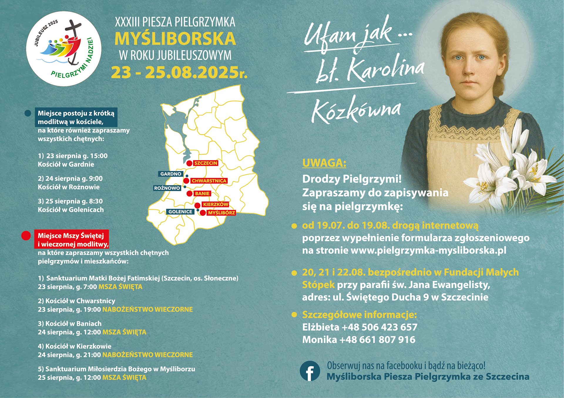 Więcej informacji na stronie: www.teo.usz.edu.ploraz na Facebooku Wydziału Teologicznego (www.facebook.com/wt.usz/?locale=pl_PL) - Kolejna 33. Piesza Pielgrzymka ze Szczecina do Sanktuarium Miłosierdzia Bożego w Myśliborzu odbędzie się w dniach od 23.08. do 25.08. Pod hasłem: „Ufam, jak… bł. Karolina Kózkówna!” Pielgrzymka przejdzie przez następujące miejscowości: Szczecin – Gardno – Chwarstnica – Rożnowo – Banie – Kierzków – Golenice – Myślibórz. Uroczysta inauguracja pielgrzymki nastąpi 23.08. (sobota) podczas Mszy Św. o godz. 7.00 w Sanktuarium Matki Bożej Fatimskiej na os. Słonecznym w Szczecinie. Zapisy są możliwe poprzez stronę internetową pielgrzymki: www.pielgrzymka-mysliborska.pl Do pielgrzymowania zapraszamy młodzież i chętnych. Relacje na żywo z trasy pielgrzymki dla osób pozostających w duchowej łączności poprzez: www.facebook.com/mysliborska