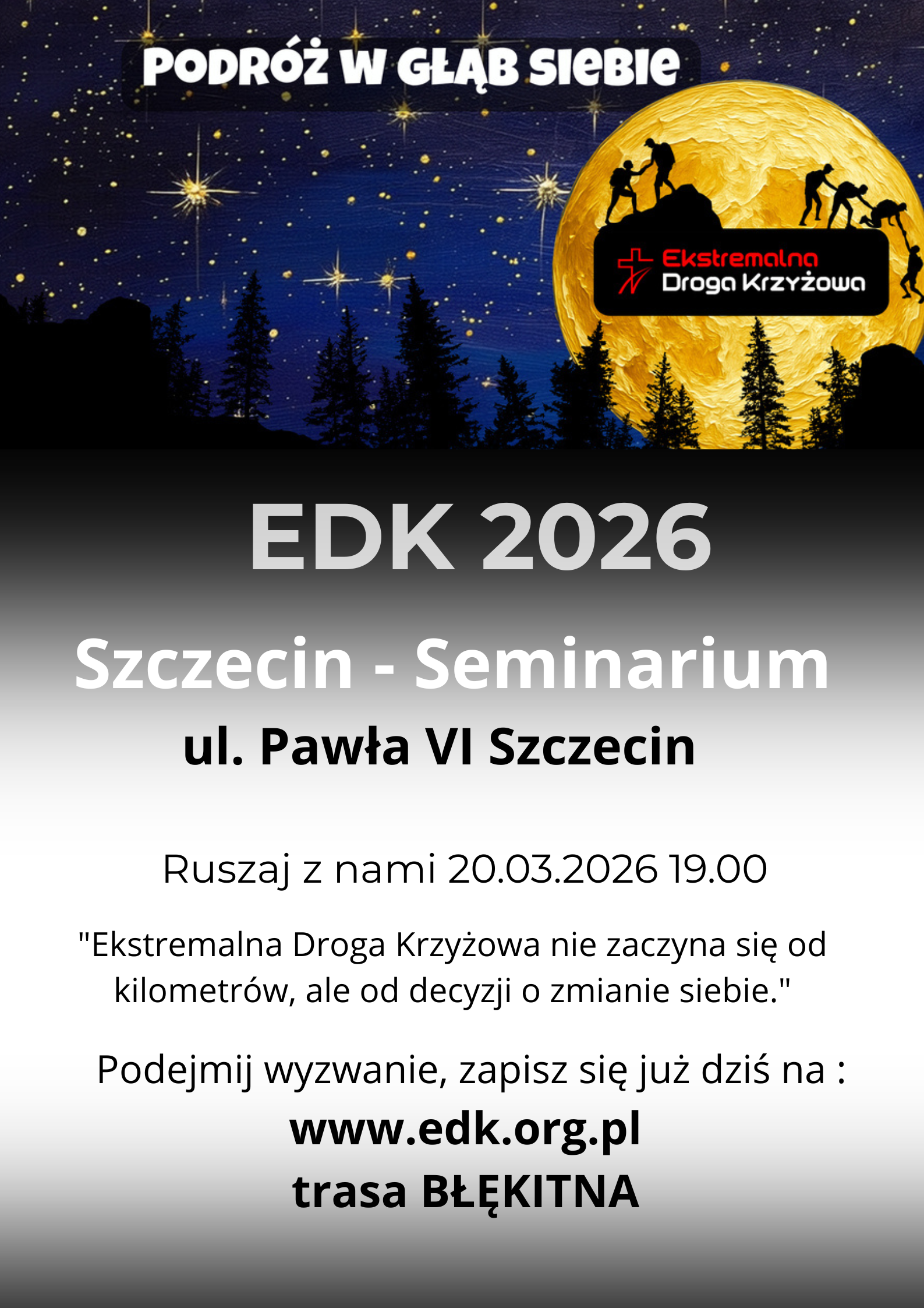 2. Ekstremalna Droga Krzyżowa odbędzie się w dniu 20 marca 2026 r. Wydarzenie rozpocznie się o godz. 19:00 Mszą Świętą w Arcybiskupim Wyższym Seminarium Duchownym przy ul. Pawła VI w Szczecinie, której przewodniczyć będzie Ksiądz Arcybiskup. Po Eucharystii uczestnicy wyruszą indywidualnie na trasę Ekstremalnej Drogi Krzyżowej. Ekstremalna Droga Krzyżowa to forma głębokiego przeżycia Wielkiego Postu – nocna modlitwa w ciszy, wysiłek fizyczny i duchowy, który pomaga uczestnikom wejść w osobiste spotkanie z Chrystusem.