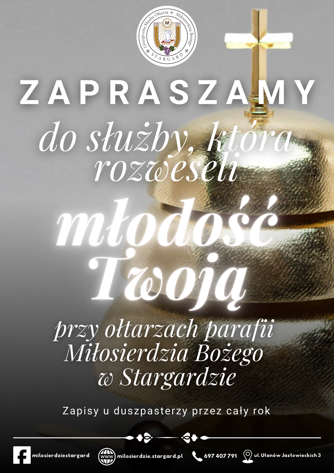 - Kandydatów do przyjęcia sakramentu bierzmowania zapraszamy na niedzielne Msze święte o godz. 16:30 a w tym tygodniu na spotkanie we wtorek w kościele o godz. 18:40.