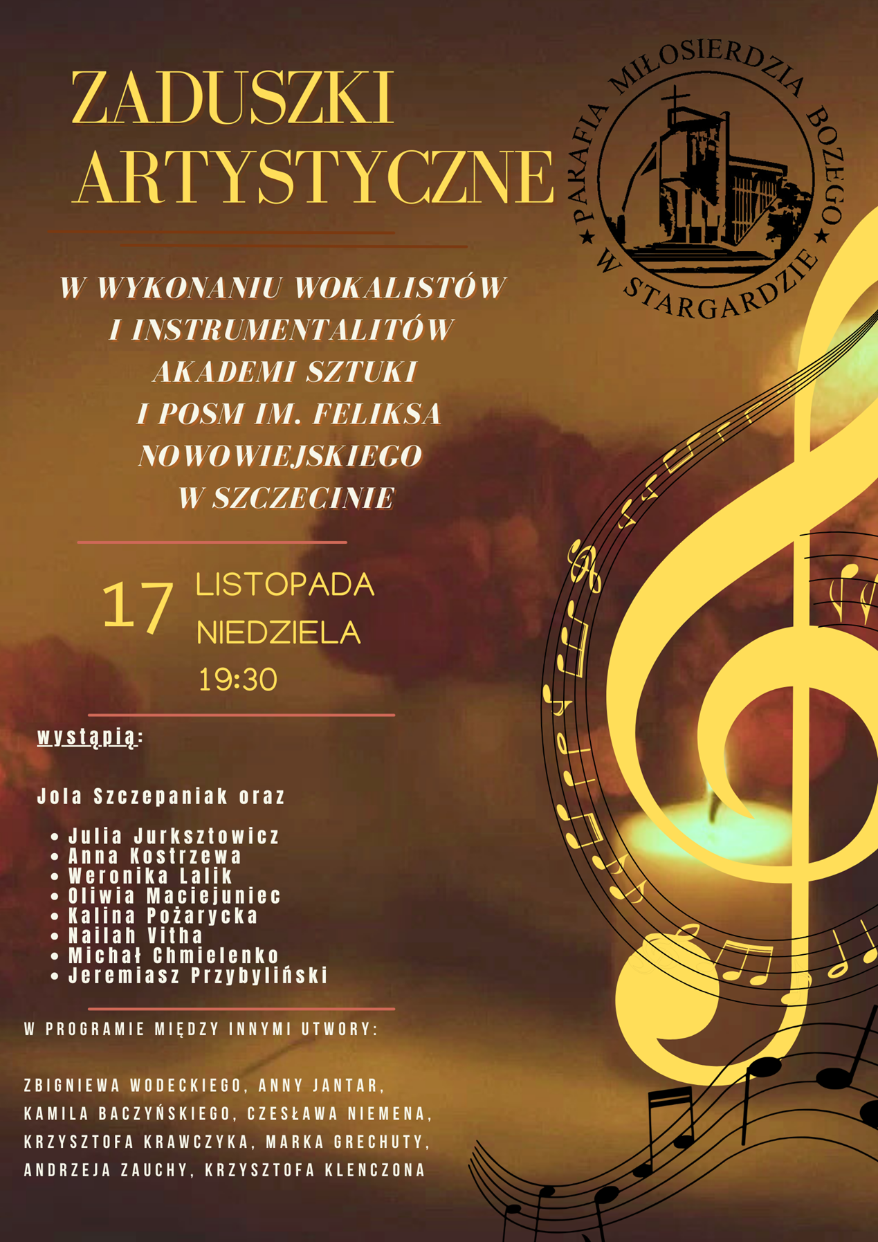 - Dzisiaj wieczorem o godz. 19:30 w naszym kościele wydarzenie muzyczne pt.: ZADUSZKI ARTYSTYCZNE, które przedstawią szczecińscy wokaliści i instrumentaliści z Akademii Sztuki oraz Zespołu Szkół Muzycznych im. Feliksa Nowowiejskiego wykonując najpiękniejsze utwory zmarłych polskich artystów: m. in.: Wodeckiego, Jantar, Baczyńskiego, Niemena, Krawczyka, Grechuty, Zauchy i Klenczona. Zapraszamy naszych drogich parafian i przyjaciół, wstęp wolny!