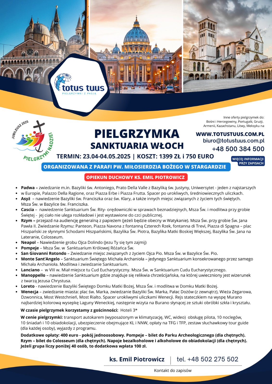 6. Zapraszamy na majówkową pielgrzymkę do Włoskich Sanktuariów, w bogatym programie: Padwa, Asyż, Cascia, Rzym, Neapol, Pompeje, San Giovanni Rotondo, Monte Sant’ Angelo, Lanciano, Manopello, Loreto i Wenecja, zapisy w zakrystii, szczegóły na plakatach.