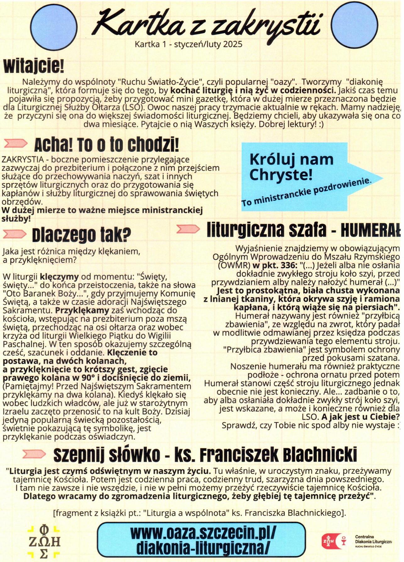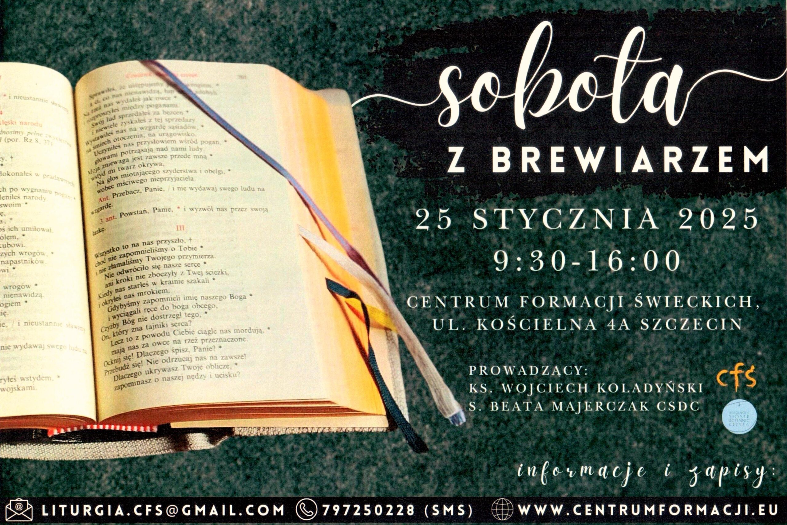 1. Centrum Formacji Świeckich prowadzone przez Wspólnotę Sióstr Uczennic Krzyża prosi o przekazanie zaproszenia na „Sobotę z brewiarzem”, które odbędzie się w sobotę, 25 stycznia br. w Centrum Formacji Świeckich, ul. Kościelna 4a, Szczecin – Stołczyn. Szczegółowe informacje i zapisy na stronie www.centrumformacji.eu, mail: liturgia.cfs@gmail.com.