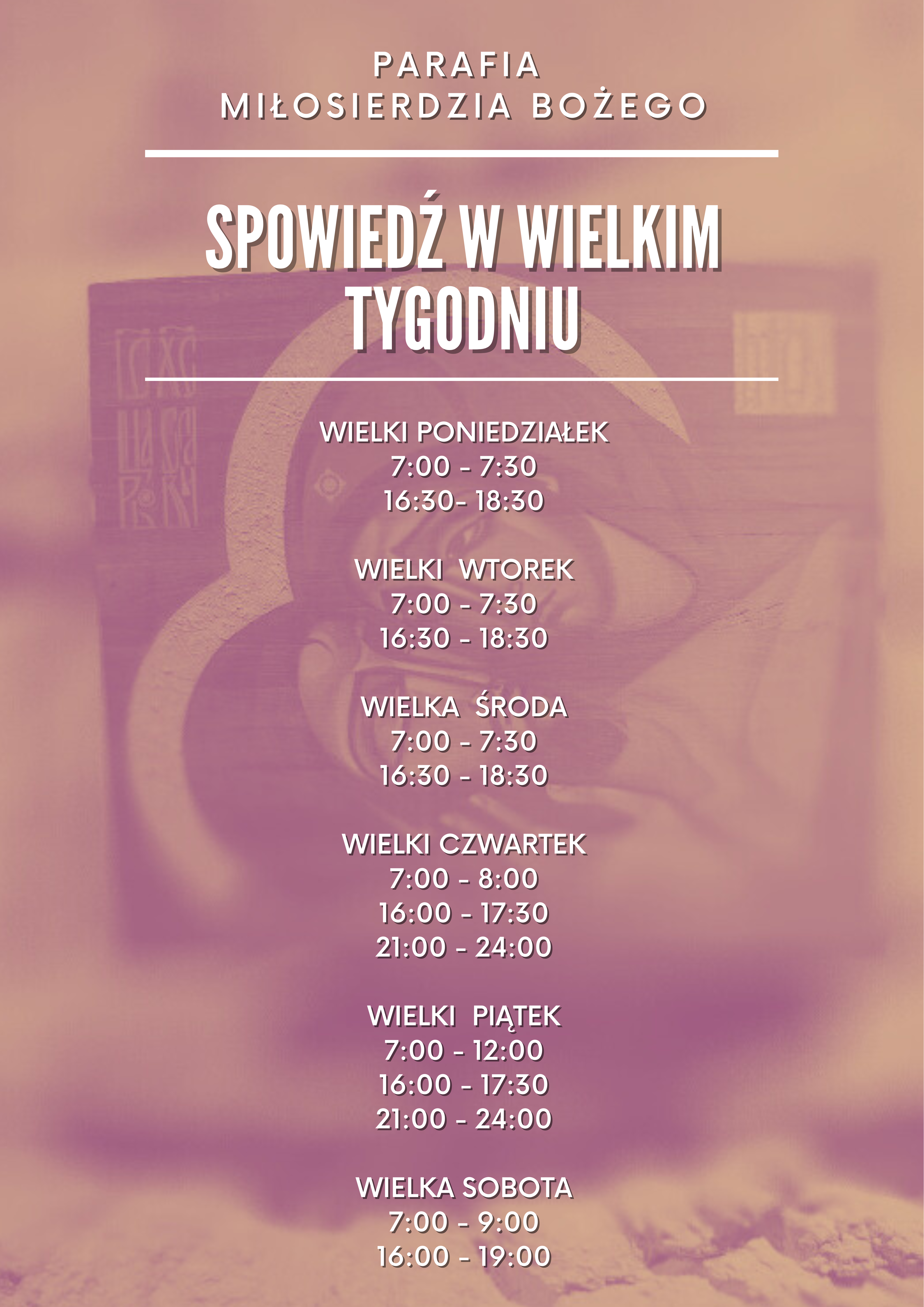 - Wielki poniedziałek, wtorek i środa (7:00 – 7:30, 16:30 – 18:30)
