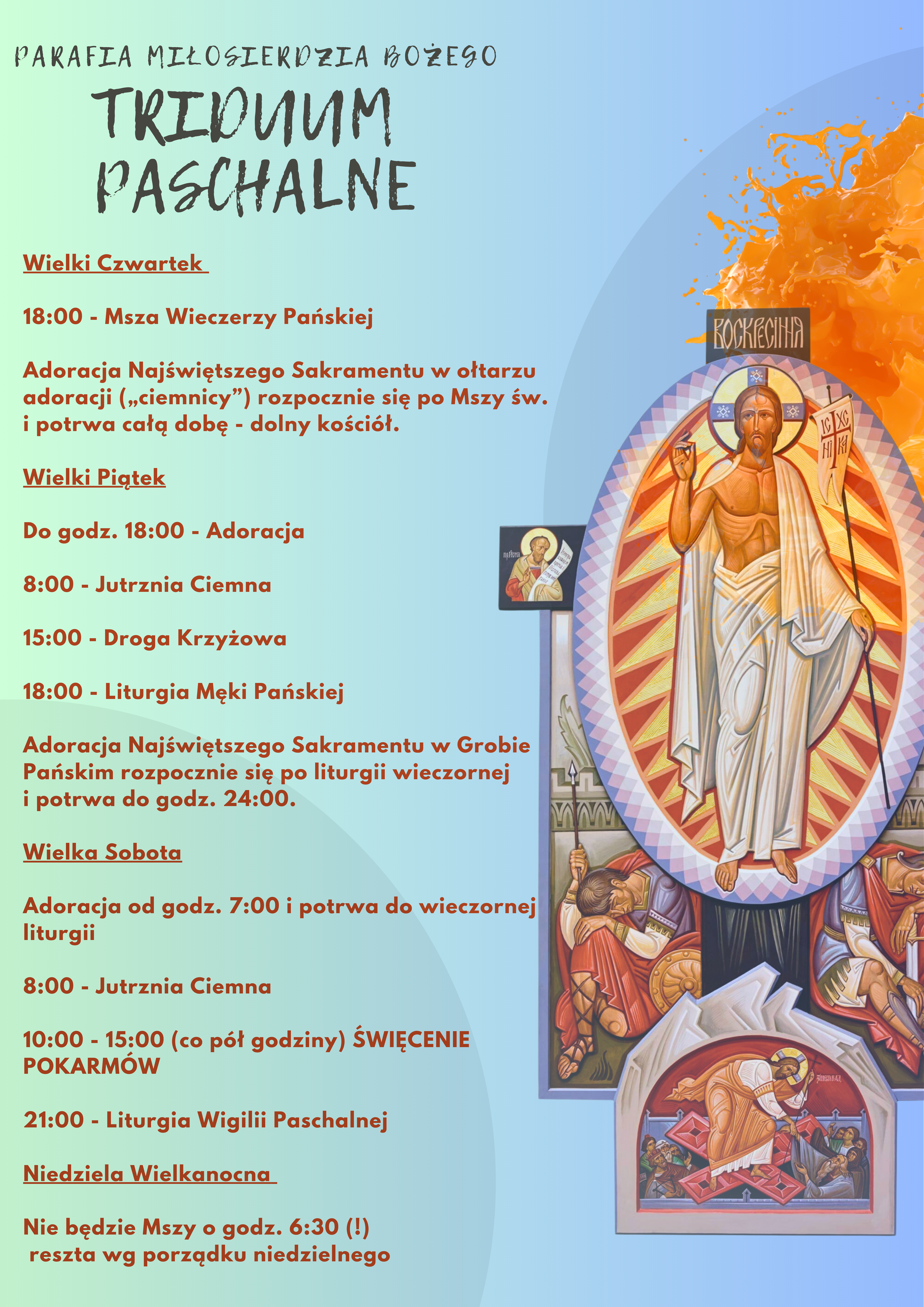 - Rozpoczynamy Wielki Tydzień, najważniejszy czas w liturgii Kościoła Świętego. W wielki czwartek wieczorem rozpocznie się Święte Triduum Paschalne (przejście Jezusa Chrystusa przez mękę i śmierć do zmartwychwstania) Zapraszamy całą nasza rodzinę parafialną i przyjaciół naszej parafii oraz świątecznych gości do przeżycia tych wyjątkowych dni udziałem w liturgii i na modlitwie.