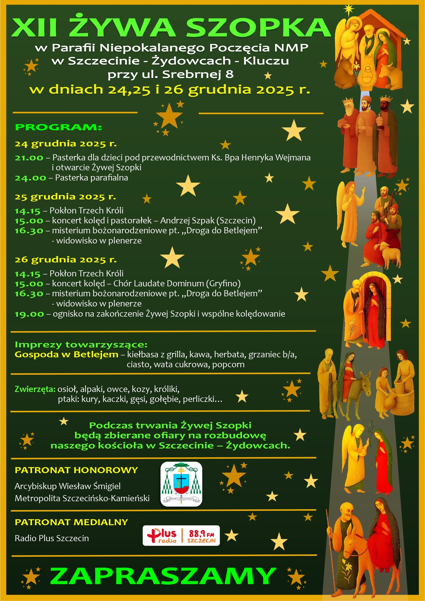 * 01.01.2026 – Msza św. noworoczna z prośbą o błogosławieństwo Boże na Rok Pański 2026 pod przewodnictwem Abpa Wiesława Śmigla o godz. 18.00. Po Mszy św. koncert kolęd w wykonaniu chórów: „Słowiki 60 im. Jana Szyrockiego” oraz „Szczecińskiego Chóru Katedralnego”. - Od 24 do 26 grudnia w parafii pw. Niepokalanego Poczęcia NMP w Szczecinie Żydowcach, ul. Srebrna 8, zostanie zorganizowana XII edycja Żywej Szopki. Odsłonięcie nastąpi podczas Mszy Świętej Pasterskiej z udziałem dzieci we wtorek, 24 grudnia o godz. 21.00. Mszy Świętej Pasterskiej będzie przewodniczył Biskup Henryk Wejman. Żywą Szopkę będzie można odwiedzać w pierwszy i drugi dzień Świąt Bożego Narodzenia. Na zakończenie, 26 grudnia o godz. 19.00 odbędzie się wspólny śpiew kolęd przy ognisku. Szczegółowy program na plakacie.