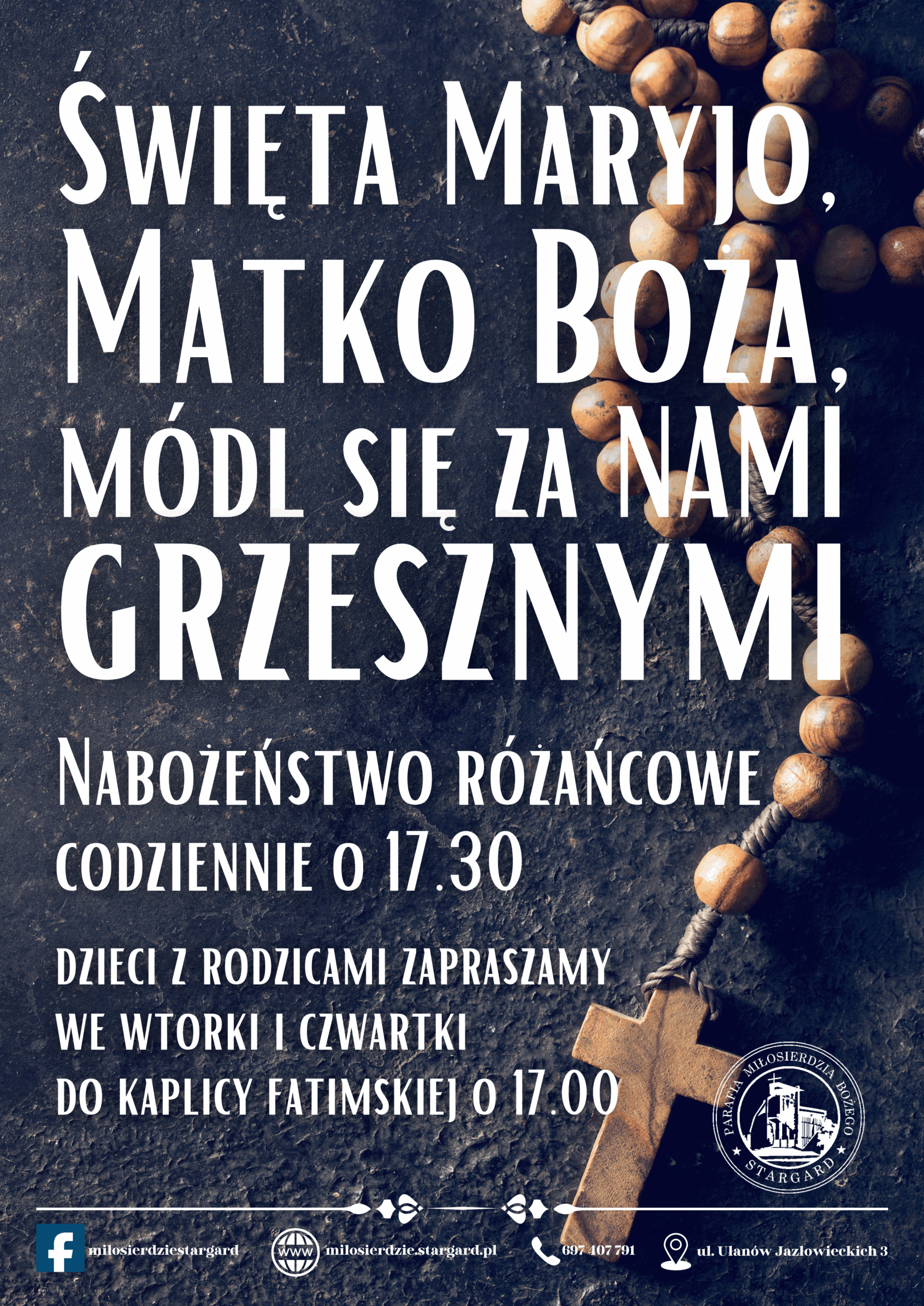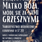 - Przed nami ostatni tydzień różańcowy. Podejmujemy na prośbę Ojca Świętego wołanie o pokój na świecie. Nabożeństwa przed Najświętszym Sakramentem o 17:30. Rodzice z dziećmi zgromadzą się we wtorek i czwartek o godz. 17:00 w kaplicy Matki Bożej Fatimskiej.