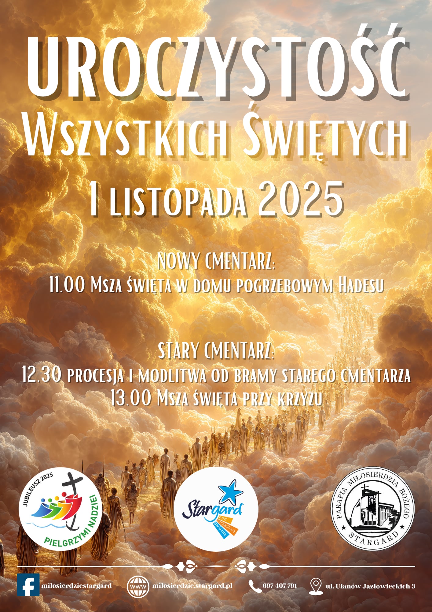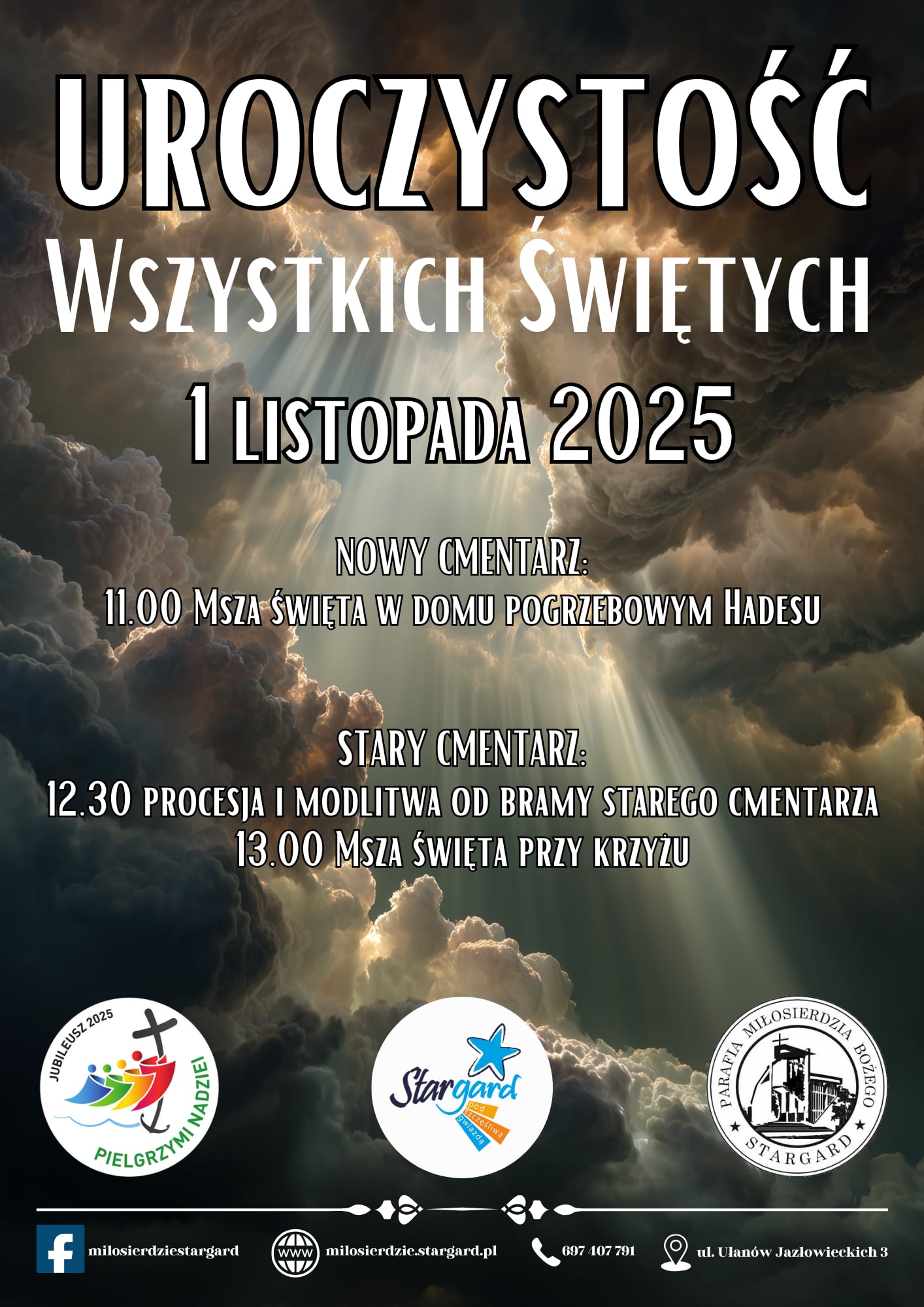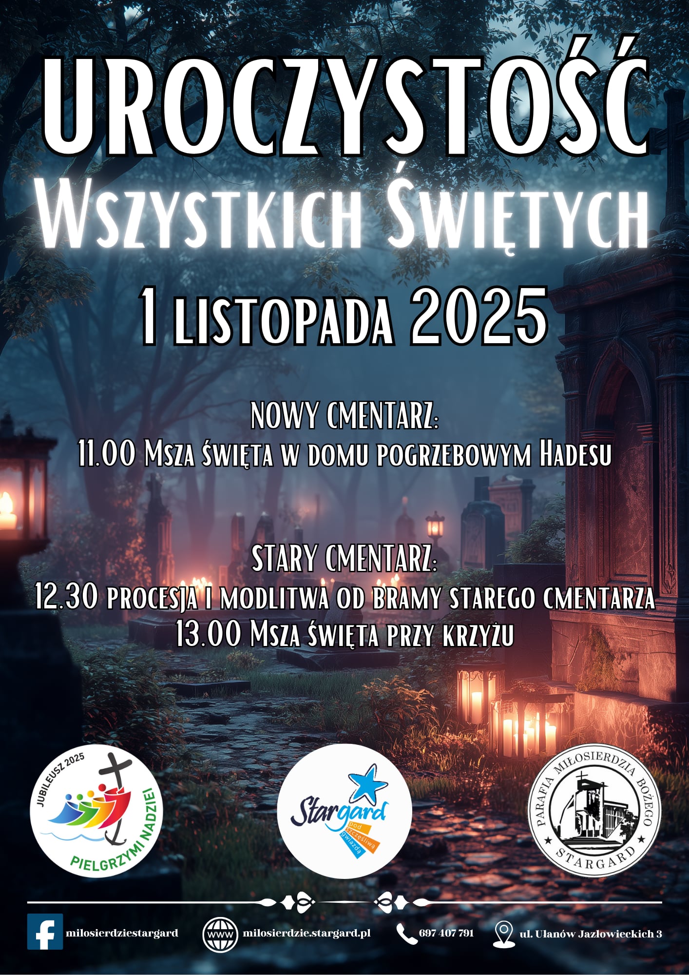 - na starym cmentarzu o godz. 13:00 w kwaterze kapłańskiej, a wcześniej o godz. 12:30 procesja modlitewna za zmarłych od bramy głównej do krzyża.