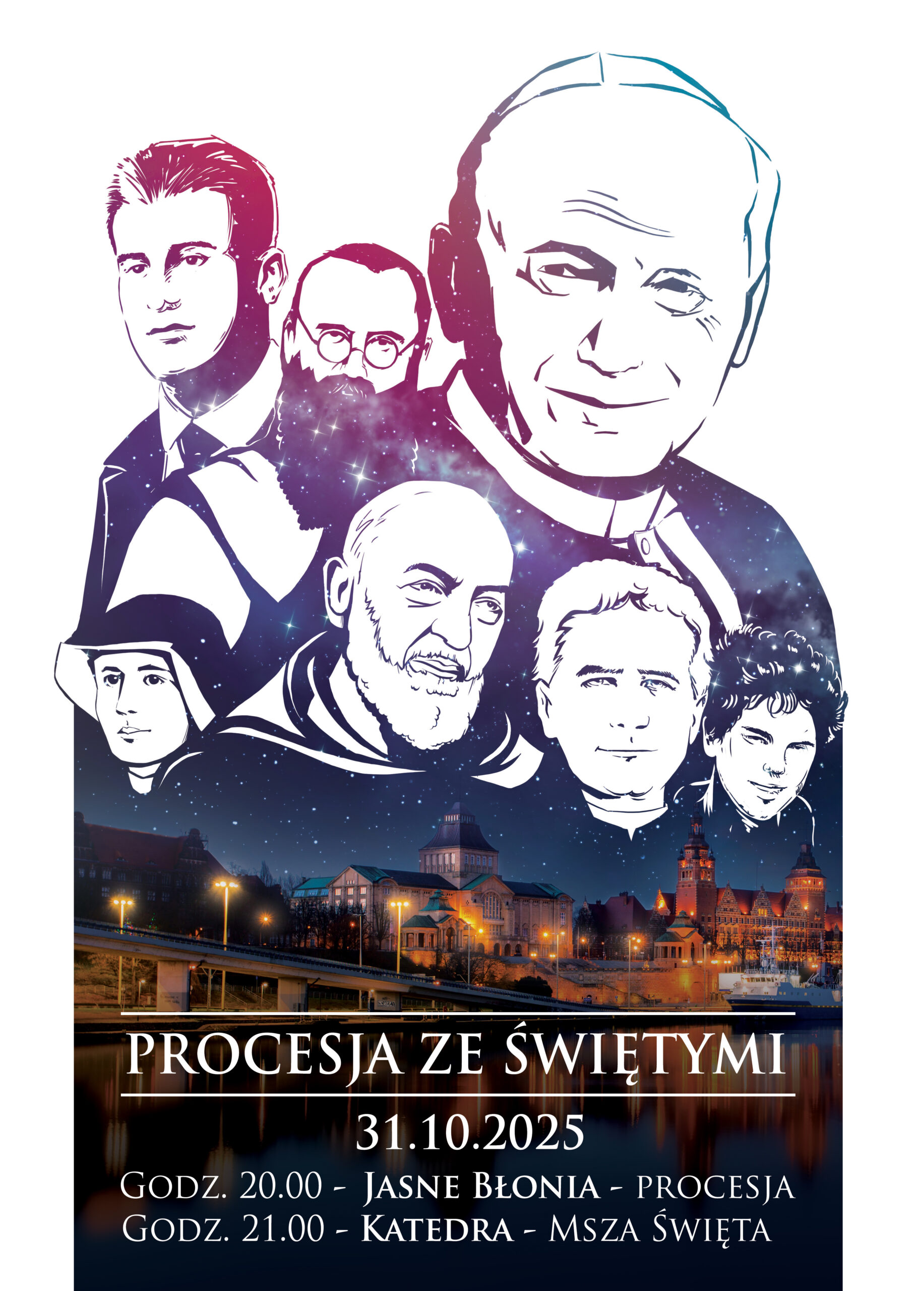 - Zapraszamy do udziału w szczecińskiej „Procesji ze Świętymi” w piątek, 31 października. Procesja wyruszy o godz. 20.00 z Jasnych Błoni od Figury św. Jana Pawła II, do Bazyliki Archikatedralnej. Po procesji będzie odprawiona Msza św., która rozpocznie się około godz. 21.00. Zapraszamy delegacje parafii, wspólnot oraz ruchów kościelnych, młodzież, harcerzy, kandydatów do bierzmowania, z relikwiami świętych i błogosławionych.