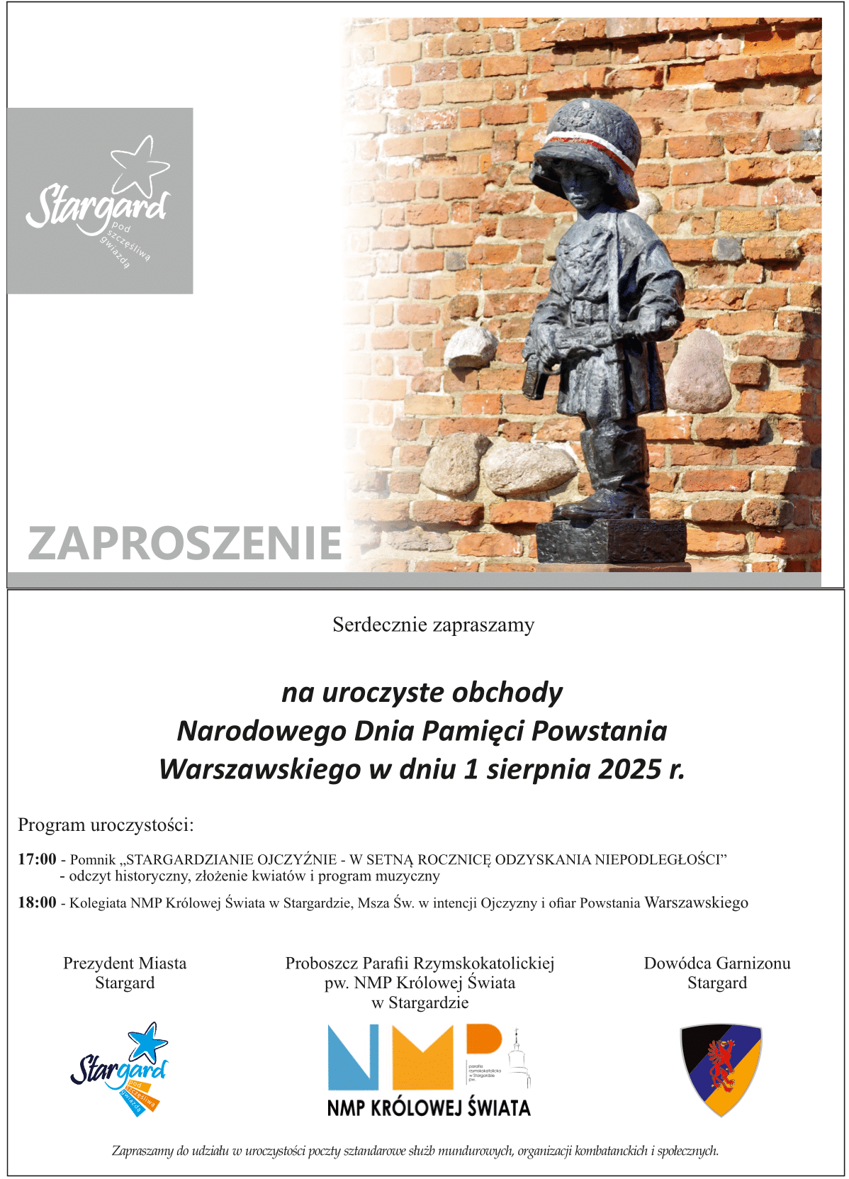 - W dniu 1 sierpnia obchodzimy Narodowy Dzień Pamięci Powstania Warszawskiego PROGRAM: 16:45 Apel Pamięci przygotowany przez Stowarzyszenie Polski Klub Patriotyczny przy pomniku Żołnierzy Wyklętych (obok cmentarza przy ul. Tadeusza Kościuszki) 17:00 – Odczyt historyczny, złożenie kwiatów i program muzyczny przy pomniku Stargardzianie Ojczyźnie – W Setną Rocznicę Odzyskania Niepodległości. 18:00 Eucharystia w stargardzkiej Kolegiacie NMP Królowej Świata w intencjach Ojczyzny i ofiar Powstania Warszawskiego. Zapraszamy.