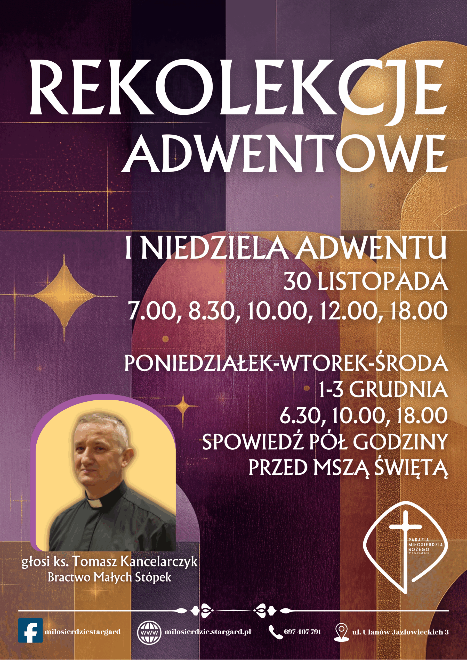 - Dziś pierwsza niedziela Adwentu, świecimy opłatki na stół świąteczny. Rozpoczynamy rekolekcje adwentowe, które prowadzi ks. kan. Tomasz Kancelarczyk ze szczecińskiej Fundacji Małych Stópek, organizator największego w Polsce Marszu dla życia. Nauki rekolekcyjne dziś oraz od poniedziałku do środy o godzinach: 6:30, 10:00 i 18:00. Adoracja Najświętszego Sakramentu w ciszy i spowiedź święta codziennie od 17:30. Modlitwie parafian i naszych przyjaciół polecamy Ojca Rekolekcjonistę i całą naszą rodzinę parafialną w czasie tych ćwiczeń duchownych. Do udziału szczególnie zapraszamy tegorocznych kandydatów do sakramentu bierzmowania. W tygodniu nie będzie środowej katechezy dla dorosłych.