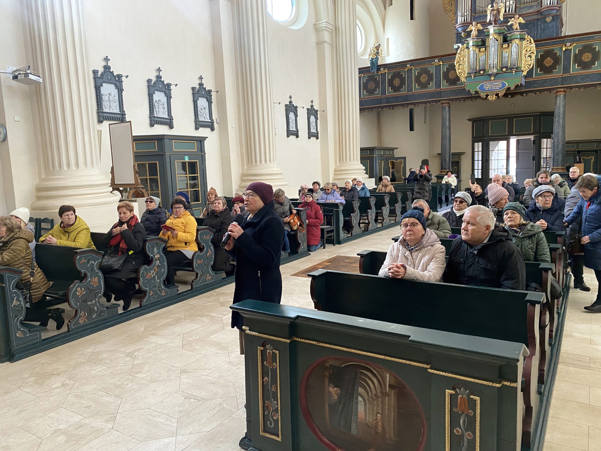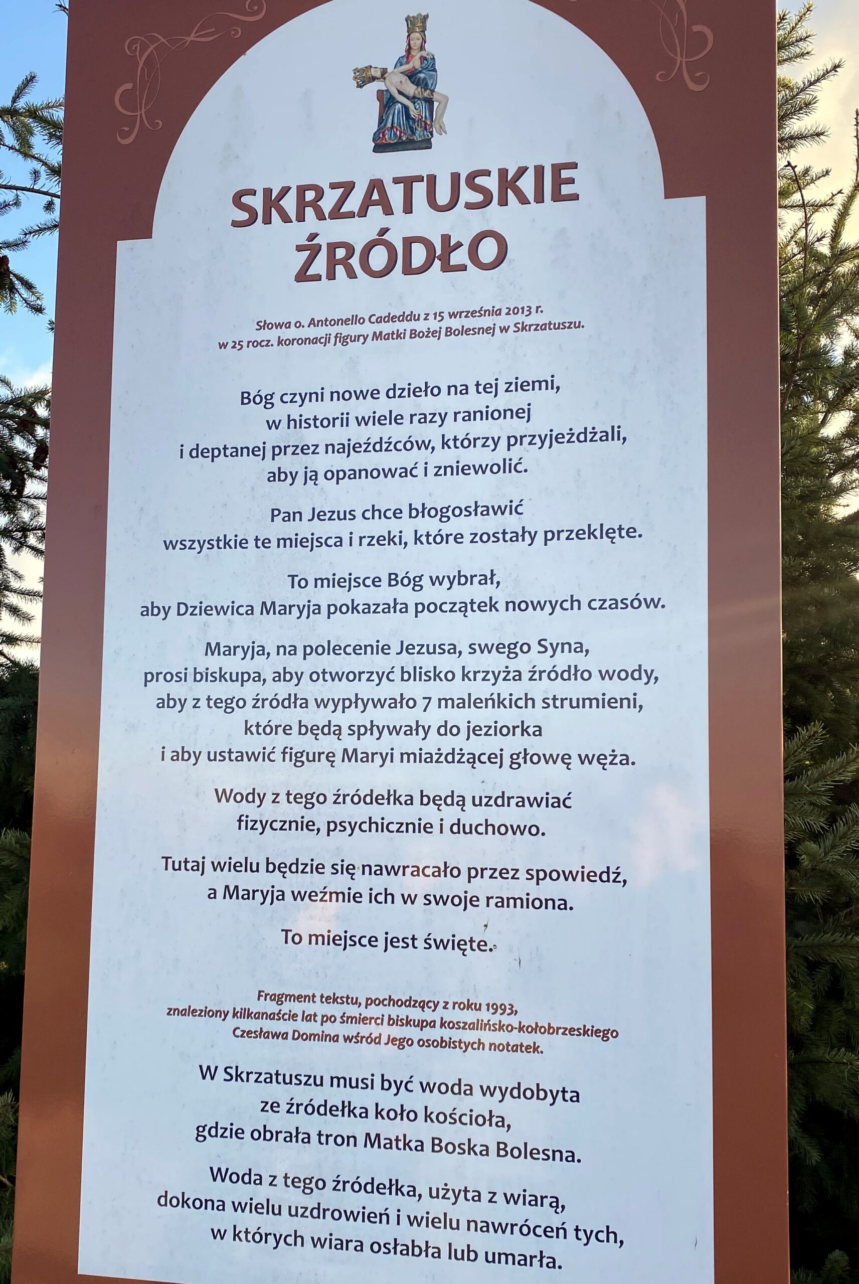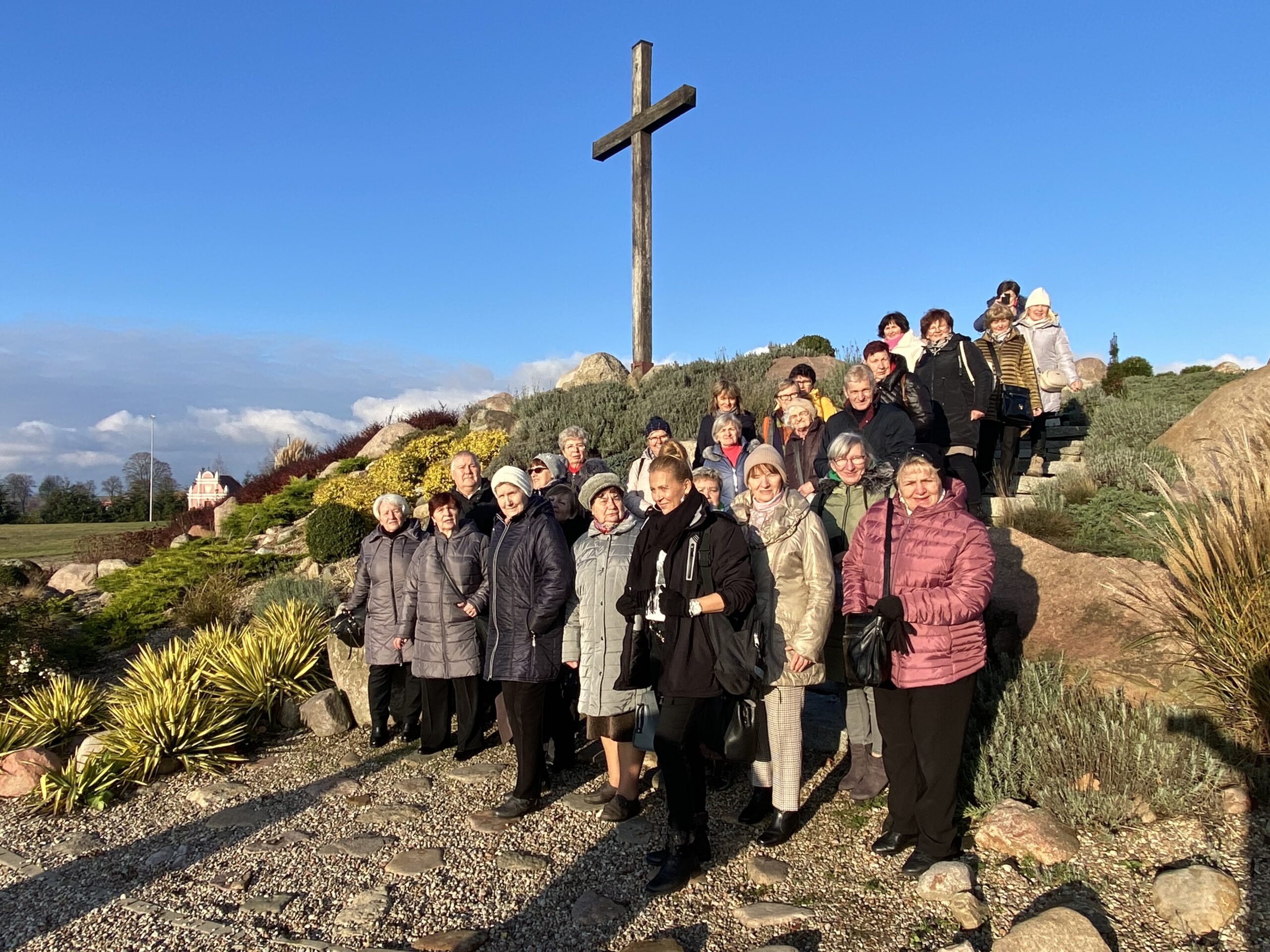 W sobotę 18 listopada w chłodny, ale słoneczny dzień u schyłku jesiennej aury udaliśmy się autokarem do Skrzatusza do Sanktuarium Matki Bożej Bolesnej zwanej także Matką Zranionej Miłości i naszej nadziei. Przed Eucharystią zagrzaliśmy się w kawiarni La Speranza przy kawie i cieście, na które zaprosił wszystkich ks. Maciej, oraz zwiedziliśmy kompleks sakralny z przewodnikiem. Poznaliśmy barwną historię bazyliki mniejszej z cudowną Pietą oraz otoczenie sanktuaryjne. W południe uczestniczyliśmy we Mszy św. transmitowanej przez diecezjalne media społecznościowe, która oprawiał miejscowy duszpasterz ks. Wojciech Kolarz. Po Mszy św. w domu pielgrzyma spożyliśmy smaczny obiad ugoszczeni przez szczecińskie Siostry Uczennice Krzyża a następnie zwiedziliśmy Kaplicę Adoracji Najświętszego Sakramentu zawierającą piękną współczesną Maryjną monstrancję. Wolny czas przeznaczyliśmy na zakup pamiątek i spacer, a najwytrwalsi pielgrzymi uzupełnili zwiedzanie o pobliskie źródełko, które wypłynęło na wzgórzu w sobotę przed Niedzielą Chrztu Pańskiego. Jego miejsce wskazał o. Antonello Cadeddu podczas modlitwy w czasie uroczystości jubileuszowych w 2013 r. Mówił wtedy, że woda wypływająca ze źródła rozleje się na siedem strumieni. Tak też się stało, a powstałe strumienie zostały pogłębione, aby woda mogła po nich swobodnie spływać.