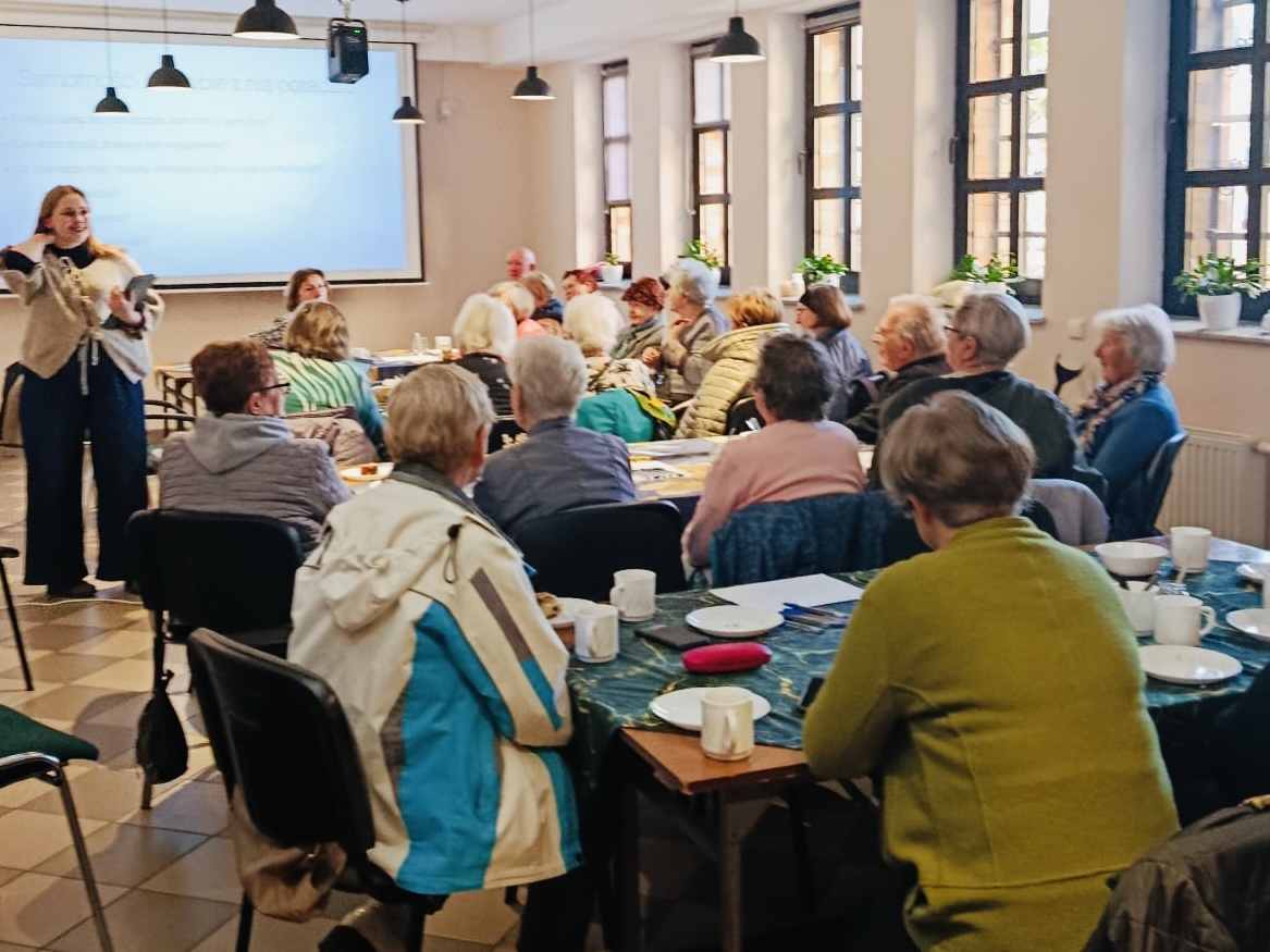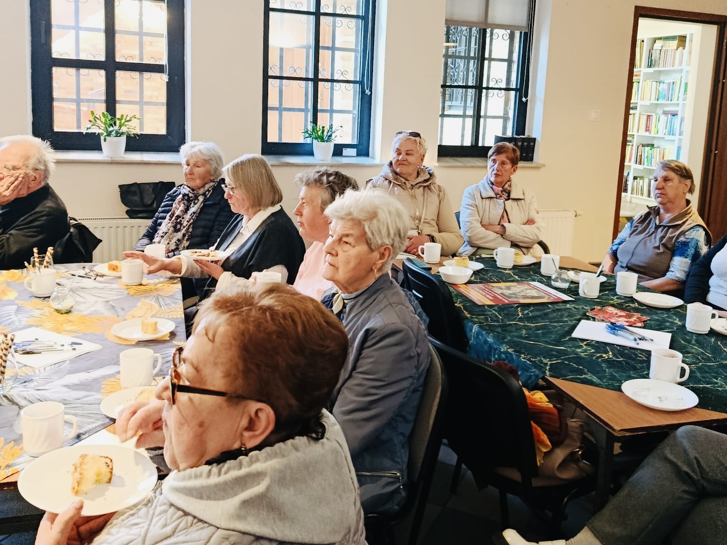 Licznie zgromadzeni seniorzy mieli okazję porozmawiać o sposobach radzenia sobie z trudnymi doświadczeniami, podzielić się swoimi przeżyciami oraz skorzystać z fachowego wsparcia. Spotkanie przebiegało w serdecznej i otwartej atmosferze, sprzyjającej wzajemnemu zrozumieniu i integracji. Rozmowy odbywały się przy herbacie i cieście, co dodatkowo stworzyło ciepły, przyjazny klimat sprzyjający budowaniu relacji.